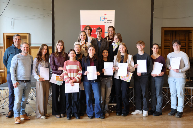 In der Altersklasse 1 diskutierten die Teilnehmenden unter anderem über eine verpflichtende insektenfreundliche Gestaltung von Privatgärten sowie über den Einsatz künstlicher Intelligenz in schriftlichen Prüfungen. Besonders überzeugend präsentierte sich Razan Berro vom Wilhelmsgymnasium Kassel, die gemeinsam mit Henri Reinhold vom Engelsburg-Gymnasium Kassel den Einzug in den Landeswettbewerb schaffte. Jonas Utpatel konnte als Drittplatzierter überzeugen.