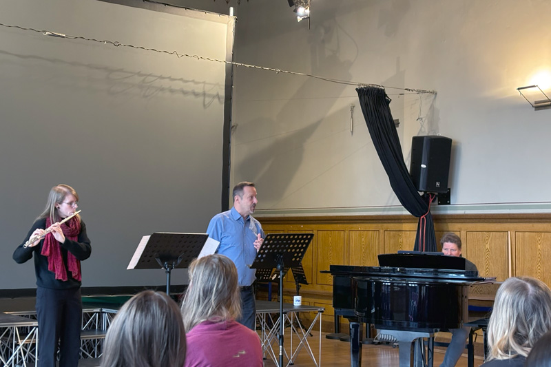 Mit Gesang von Jürgen Appel, Querflötenklängen von Milena Lenger und Klavierbegleitung durch Martin Forciniti präsentierten die Künstler eine eindrucksvolle Auswahl musikalischer Werke. Die Darbietungen wurden durch eine kenntnisreiche und ansprechende Moderation ergänzt, die den Schülerinnen und Schülern den roten Faden der Musikgeschichte nachvollziehbar machte.